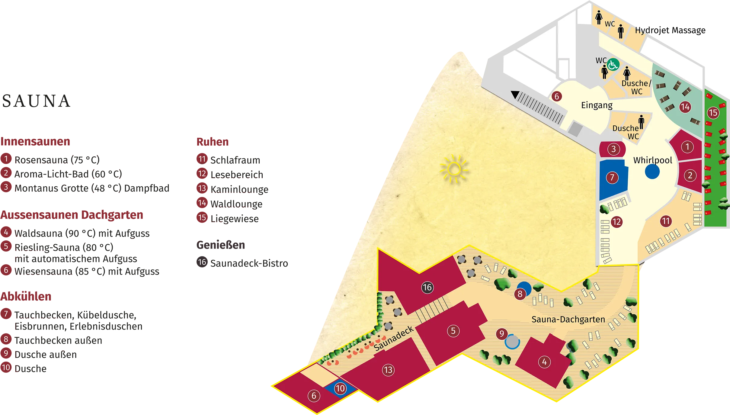 Dans l’ambiance d’une cave à vin du Palatinat, ce sauna présente la région sous son aspect le plus agréable. La chaleur douce et l’atmosphère particulière invitent à une transpiration relaxante.