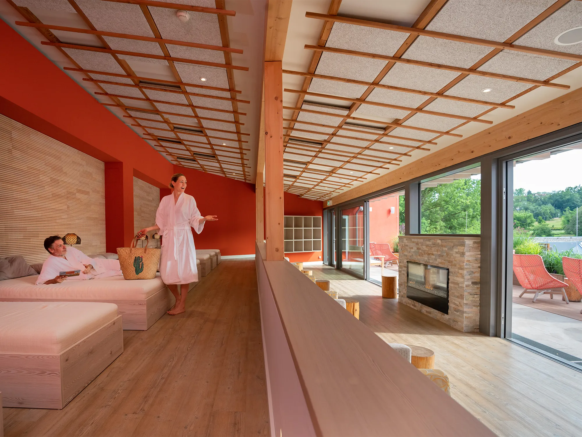 Que ce soit de manière conviviale sur le jardin de toit du sauna, rustique dans le salon forestier ou confortable dans le salon cheminée – partout se trouvent des lieux de retraite pour lire, se reposer ou simplement se détendre et déconnecter. Pendant les mois d’été, le jardin de toit invite aux bains de soleil naturistes et le pont du sauna à la détente.